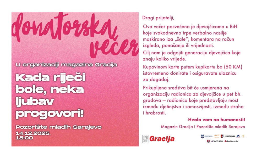 Magazin Gracija u saradnji s Pozorištem mladih Sarajevo organizuje Donatorsko večer – Kada riječi bole, neka ljubav progovori, posvećenu djevojčicama u Bosni i Hercegovini. Verbalno nasilje, često prikriveno iza „šale“, komentara na izgled, ponašanje ili vrijednost, postalo je svakodnevica.