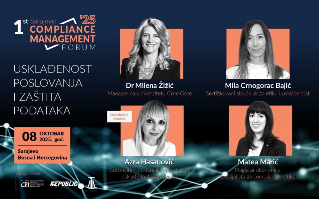 Sarajevo će ove jeseni postati centar stručnjaka za usklađenost poslovanja i zaštitu podataka. U glavnom gradu BiH održava se 1st Sarajevo Compliance Management Forum, događaj koji će okupiti vodeće eksperte iz BiH, Crne Gore i regiona, s ciljem razmjene znanja, iskustava i najboljih praksi u oblasti compliance-a i savremenog korporativnog upravljanja.